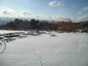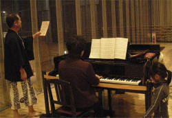 そしてさらに移動中。体育館の横に設置されていたピアノ。そこに偶然居合わせたご婦人の演奏で、「千の風になって」を熱唱するMr.Otuka☆〜♪ 体育館からも拍手が!! |